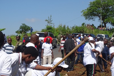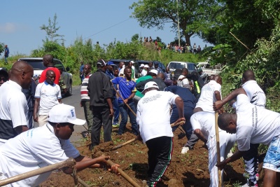 Curage des caniveaux d'eaux, ce samedi le 01/04/2017 lors des travaux communautaires de développement le long de la RN1 sur la colline MUBERURE, Zone BENGA, Commune Isare par la Direction Générale de l'Office des Routes, en collaboration avec le Ministère des Transports, des Travaux Publics et de l’Équipement.