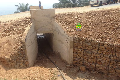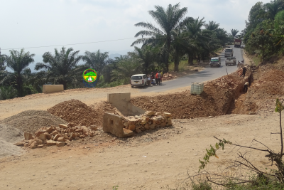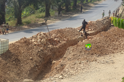 RN1PK12+500: Fouille des caniveaux en vue de la construction d'un fossé maçonné en cours. Il reste les travaux de finissage dont la mise en place du béton bitumineux et l'aménagement à l'amont du dalot.