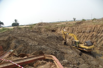 et au PK 5+700 où se déroulent les travaux de bétonnage du mur de tête en béton armé et remblayage pour la reconstitution de la chaussée de la route.