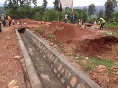 Travaux de stabilisation d'un ravin de la RN6 au PK33.Travaux en cours: construction d'un caniveau qui acheminera l'eau vers la rivière "Nkaka".