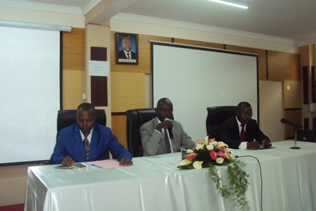 Le Ministre au milieu, le Directeur Général de l'Office des Routes à droite et le Représentant Résident de la Banque Mondiale au Burundi à gauche